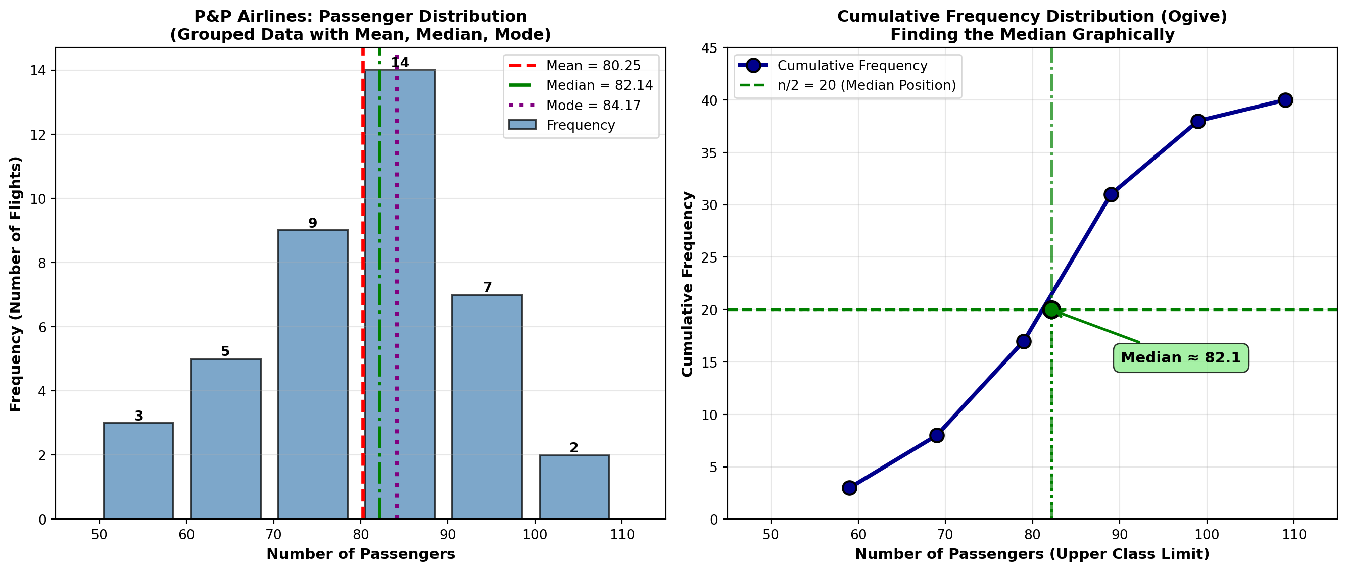 Interpretation: The average monthly sales revenue is $57,400. This represents the typical monthly performance. Notice that the value 67 appears twice (the mode), but the mean (57.4) falls below this repeated value because the lower values (45, 52, 56) pull the average down.