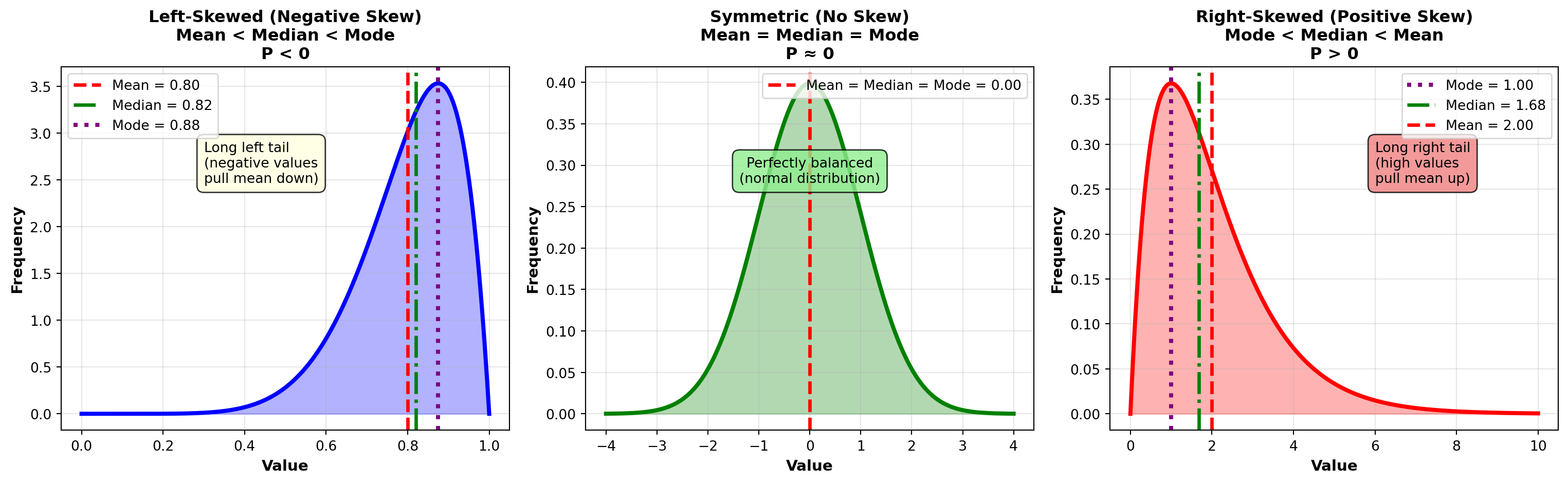 - Left-skewed: Mean < Median