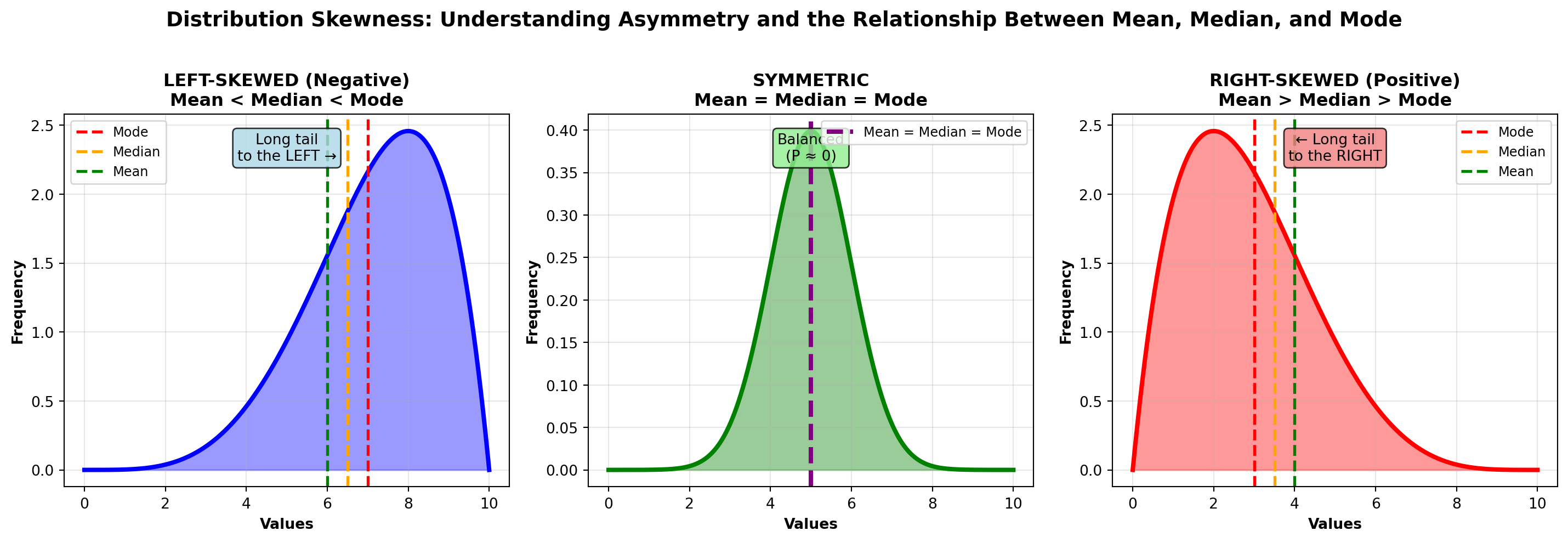 - Right-skewed: Mean > Median (most common for income, prices)