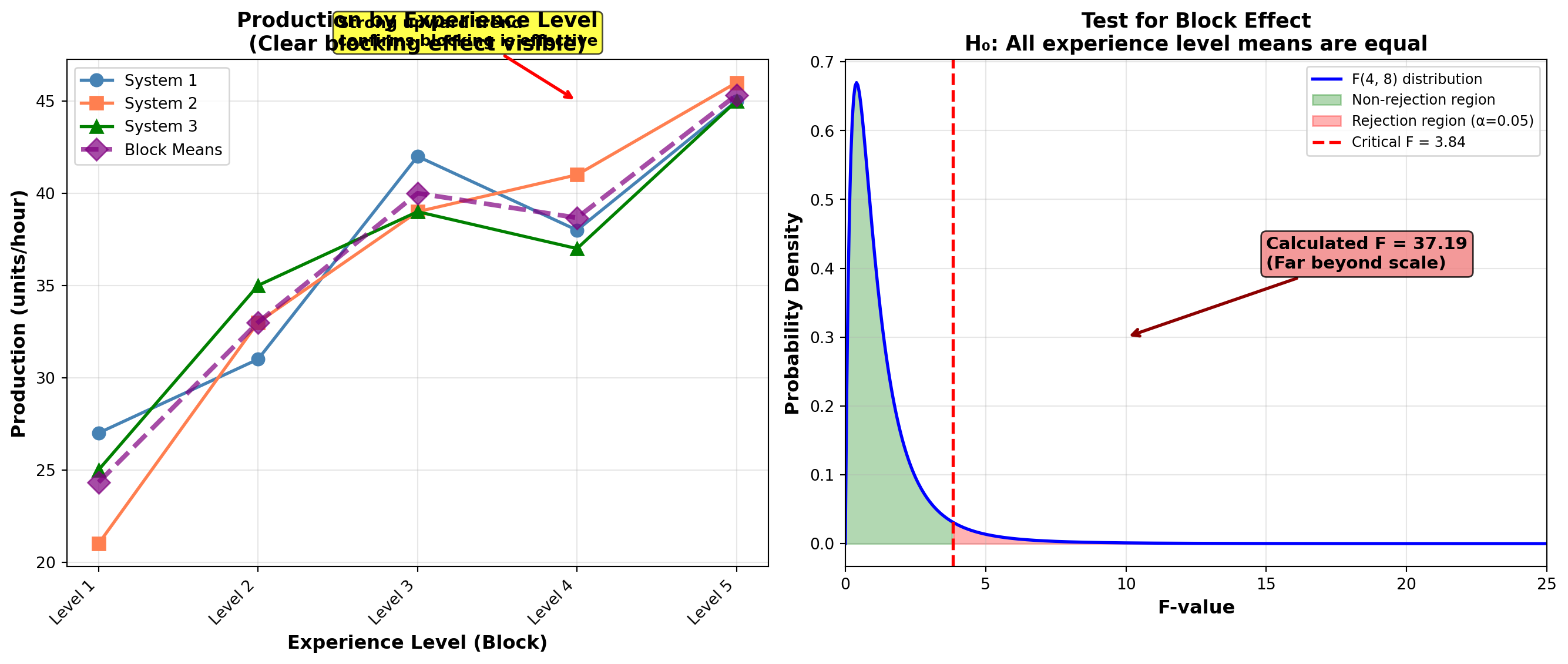 Should you block on driver? YES! Driver effect is highly significant (F(4,12) = 4.75, p = 0.016 < 0.05). Drivers show significantly different average times ranging from 11.25 to 17.75 minutes. Blocking was essential to control for this variability.