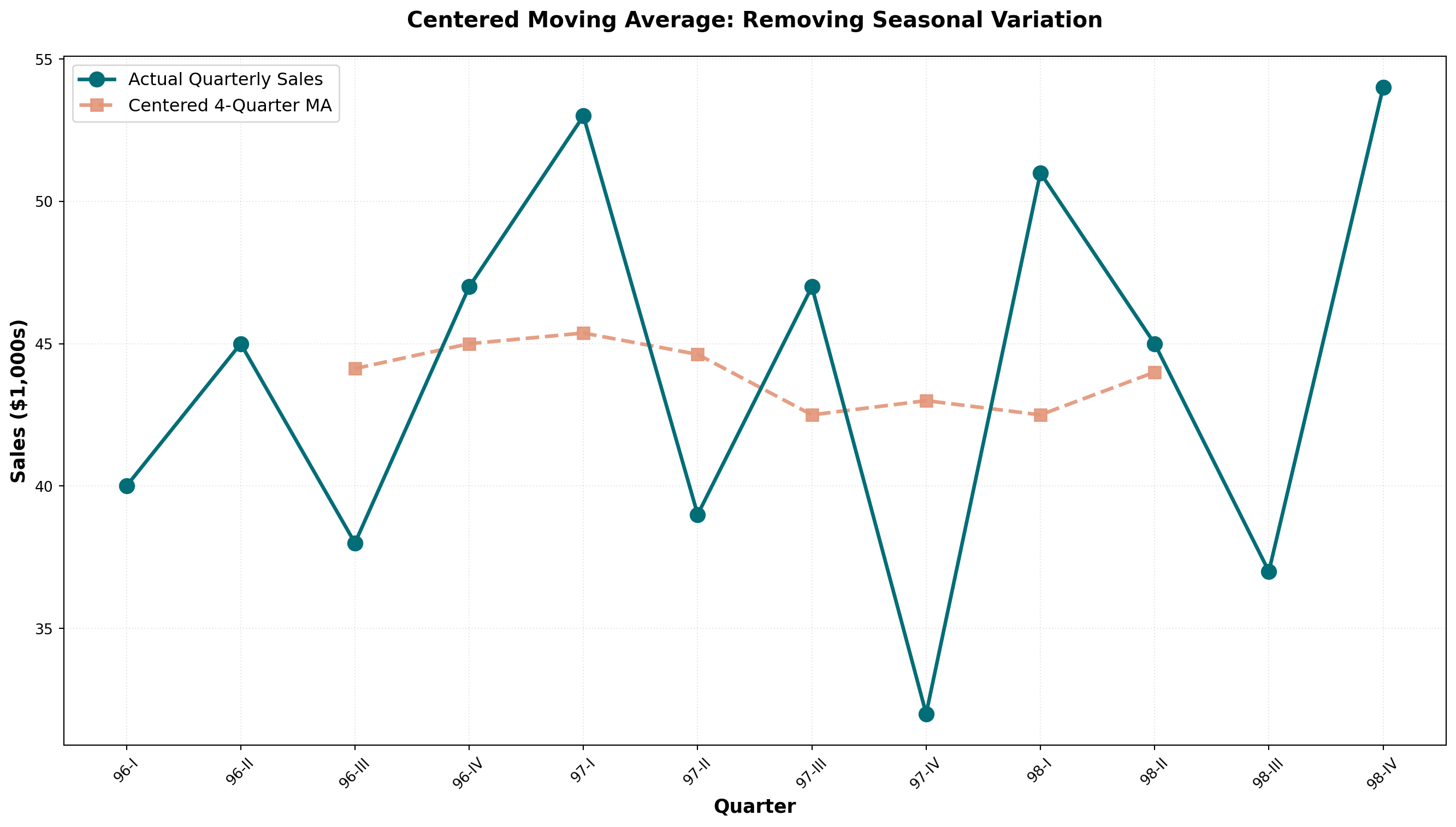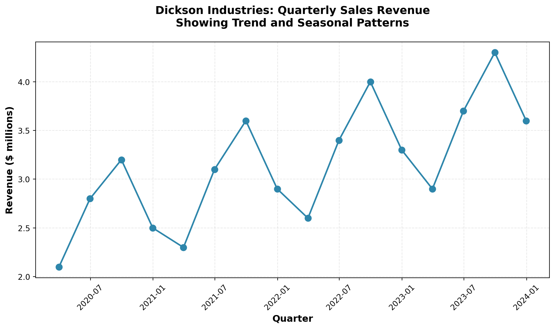 ax.set_title('Dickson Industries: Quarterly Sales Revenue\nShowing Trend and Seasonal Patterns',