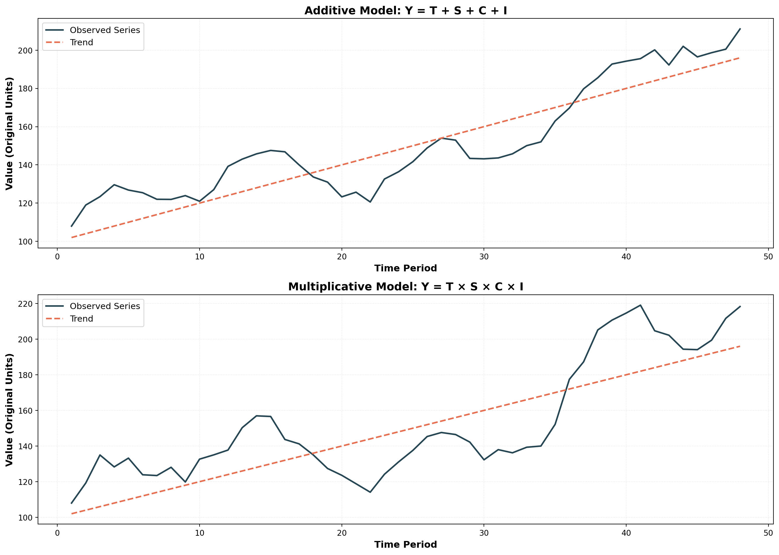 - Multiplicative (preferred): Y_t = T_t \times S_t \times C_t \times I_t