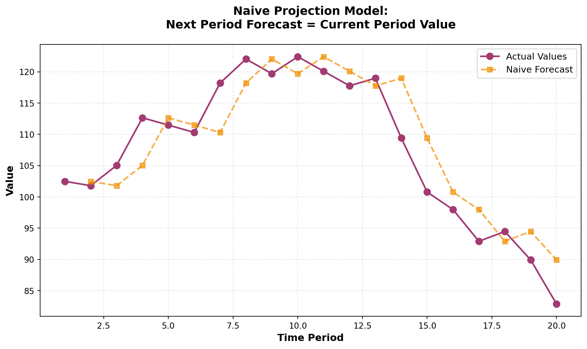The simplest form of forecasting is the naive projection model, which assumes that the next period’s value will equal the current period’s value: