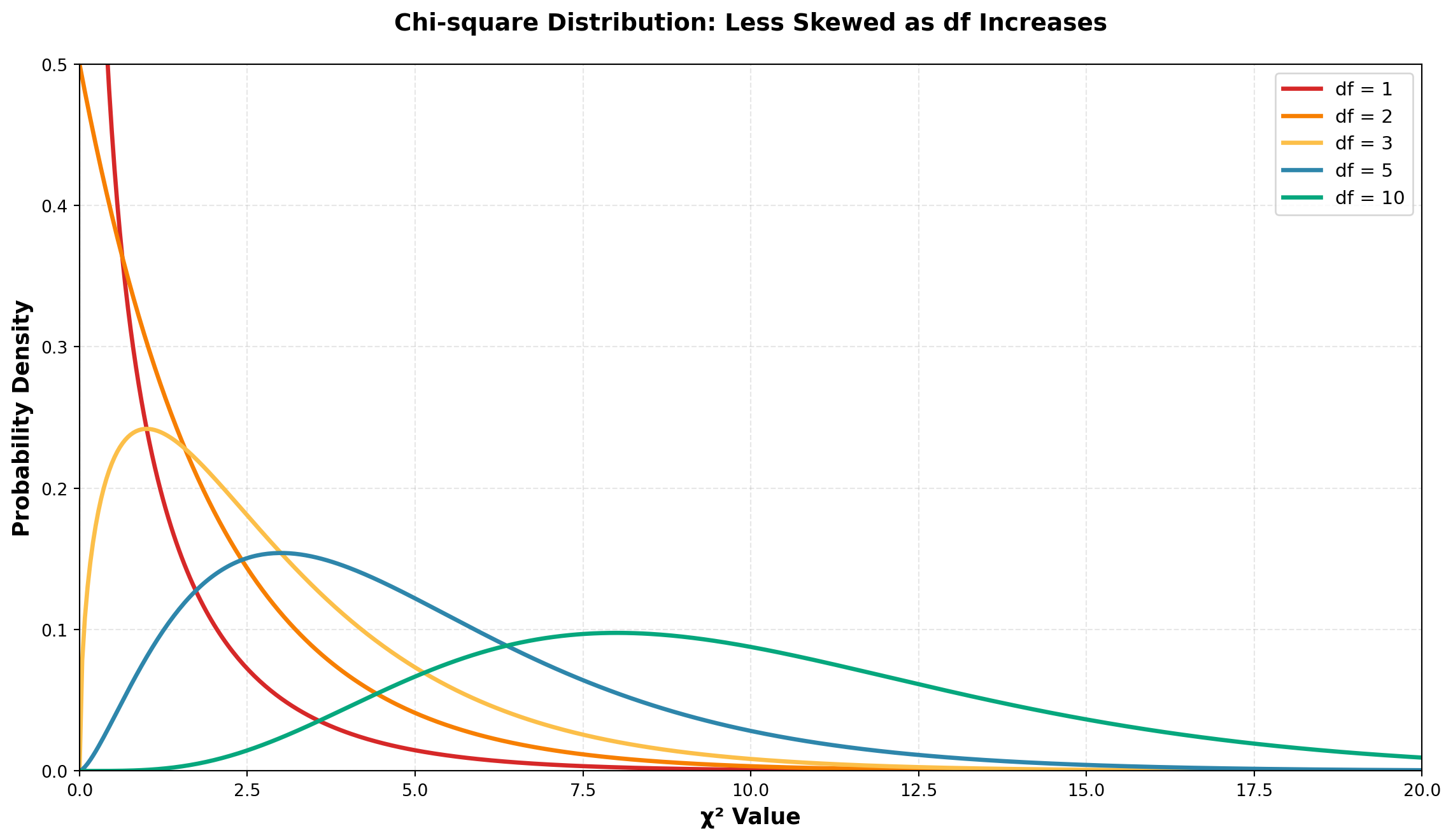 plt.show()As the number of degrees of freedom increases, the chi-square distribution becomes less skewed and more symmetric. With higher df values, the distribution begins to resemble a normal distribution.