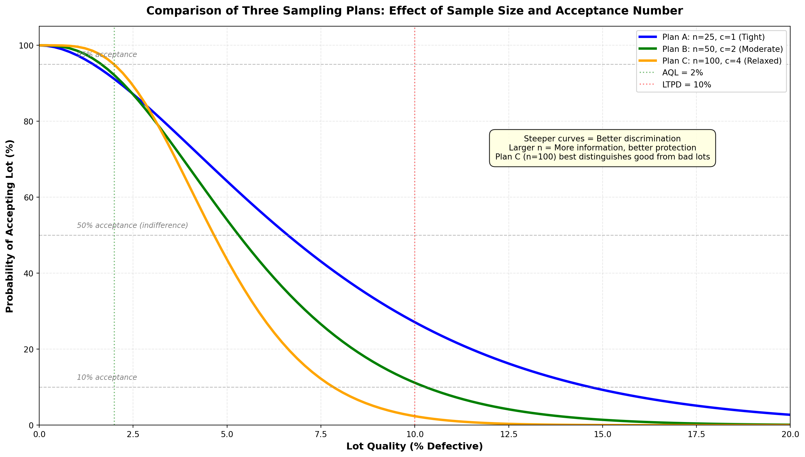 - OC curves: Show probability of acceptance for different lot qualities