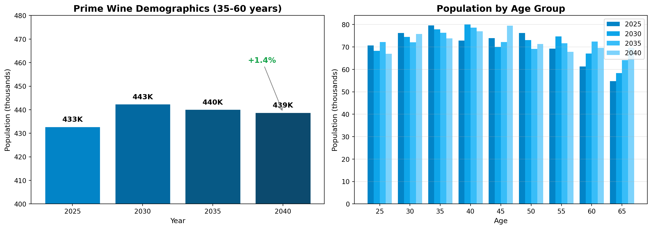 Implication: The domestic market has ~5 years of demographic tailwind before it plateaus. Consider: - Premium positioning now while the market is growing - Building brand loyalty with 35-45 year olds who will remain customers for decades
