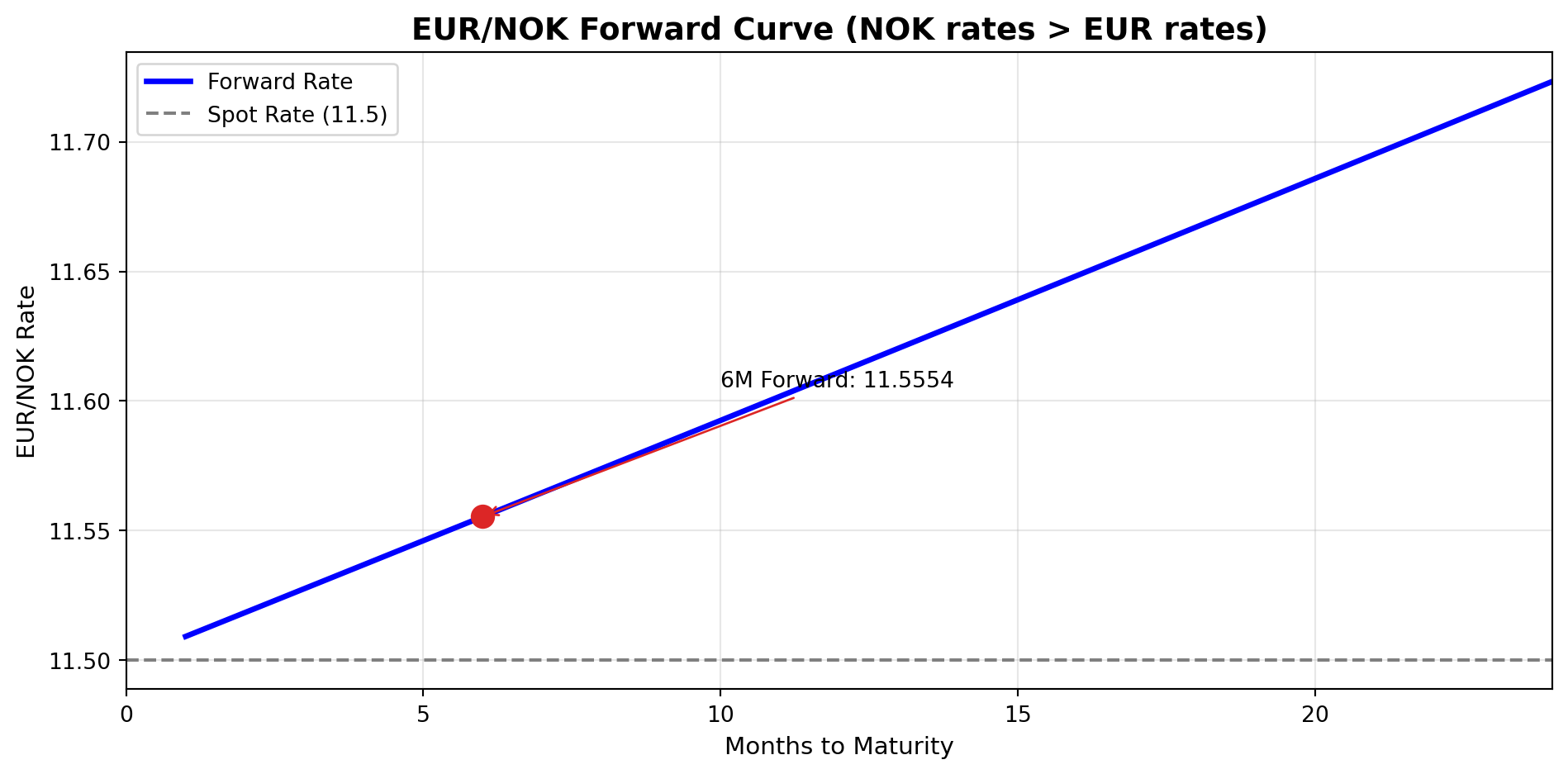 When Norwegian interest rates are higher than Euro rates (4.5% vs 3.5%), the EUR trades at a forward premium — meaning you pay more NOK per EUR in the forward market than at spot.