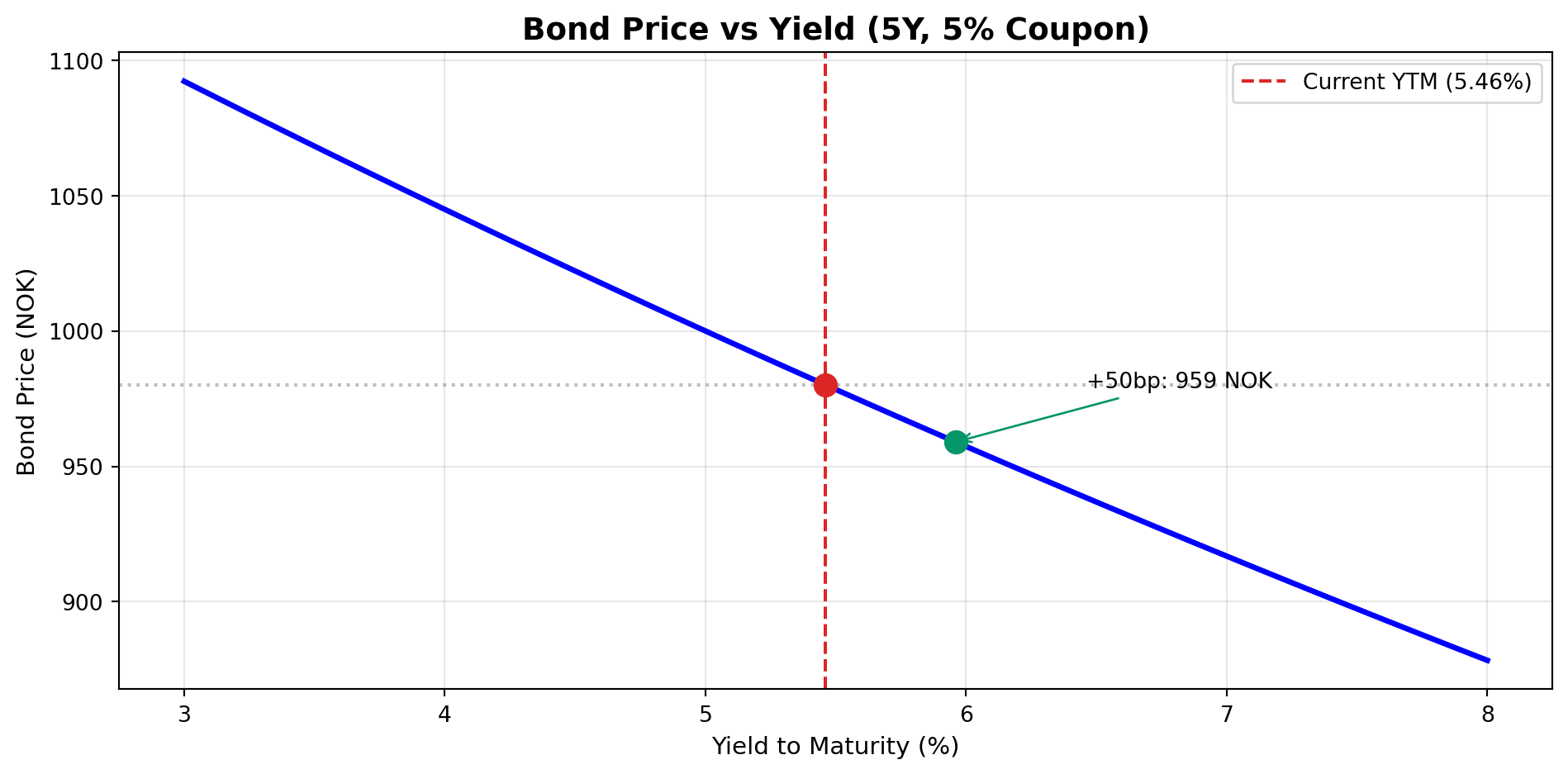With a 4.36-year duration: - +0.50% rates → -2.18% price drop - +1.00% rates → -4.36% price drop