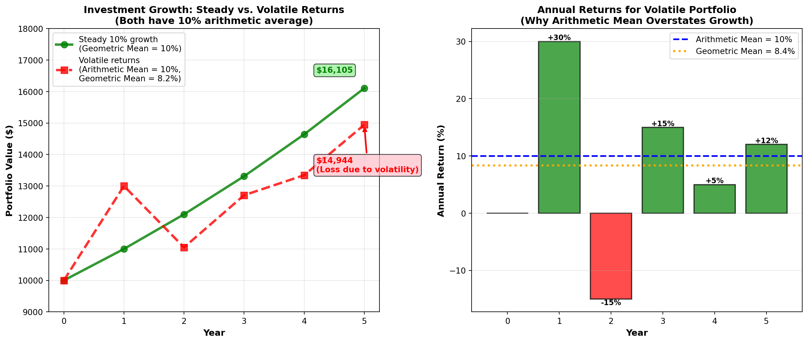 - Growth rates/returns: Use Geometric Mean (compounds correctly)