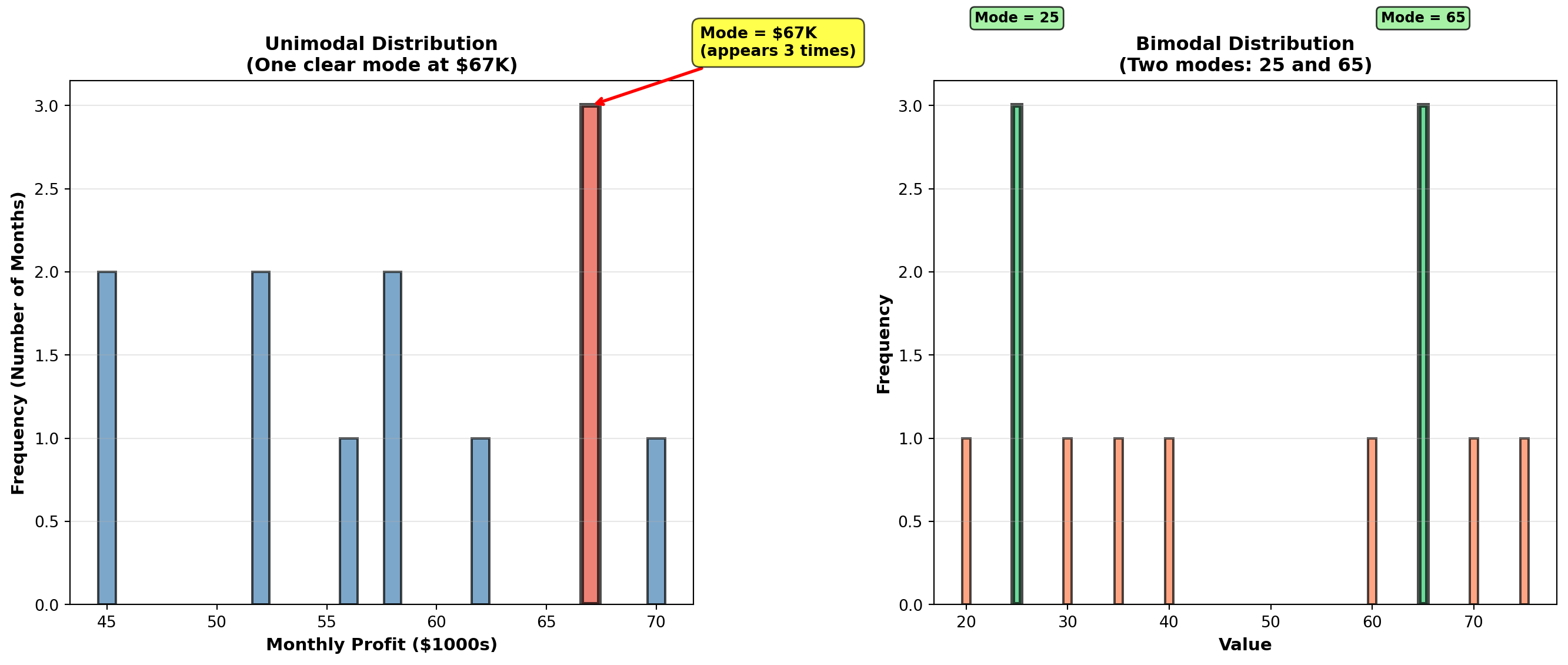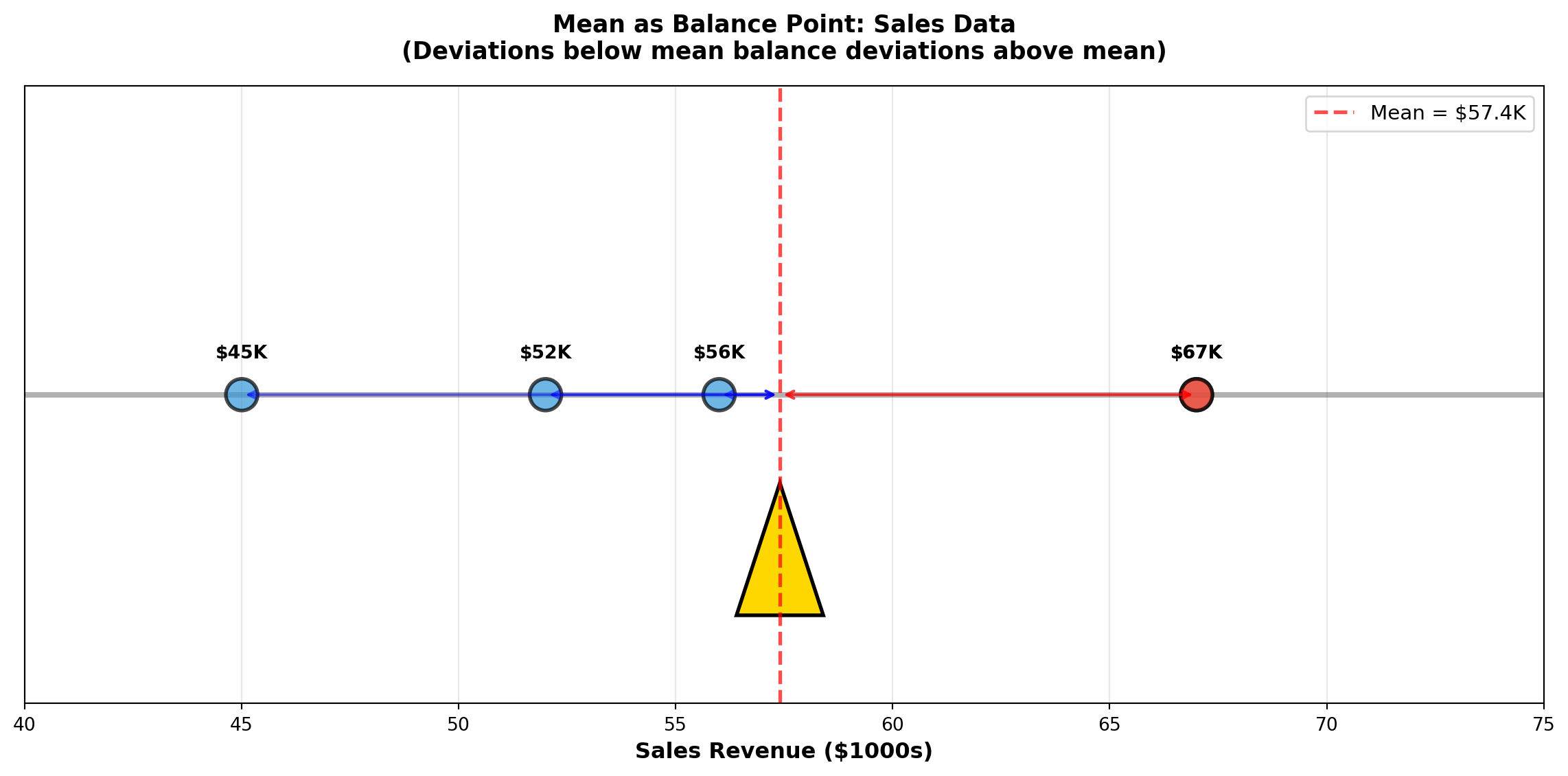 Interpretation: The average monthly sales revenue is $57,400. This represents the typical monthly performance. Notice that the value 67 appears twice (the mode), but the mean (57.4) falls below this repeated value because the lower values (45, 52, 56) pull the average down.