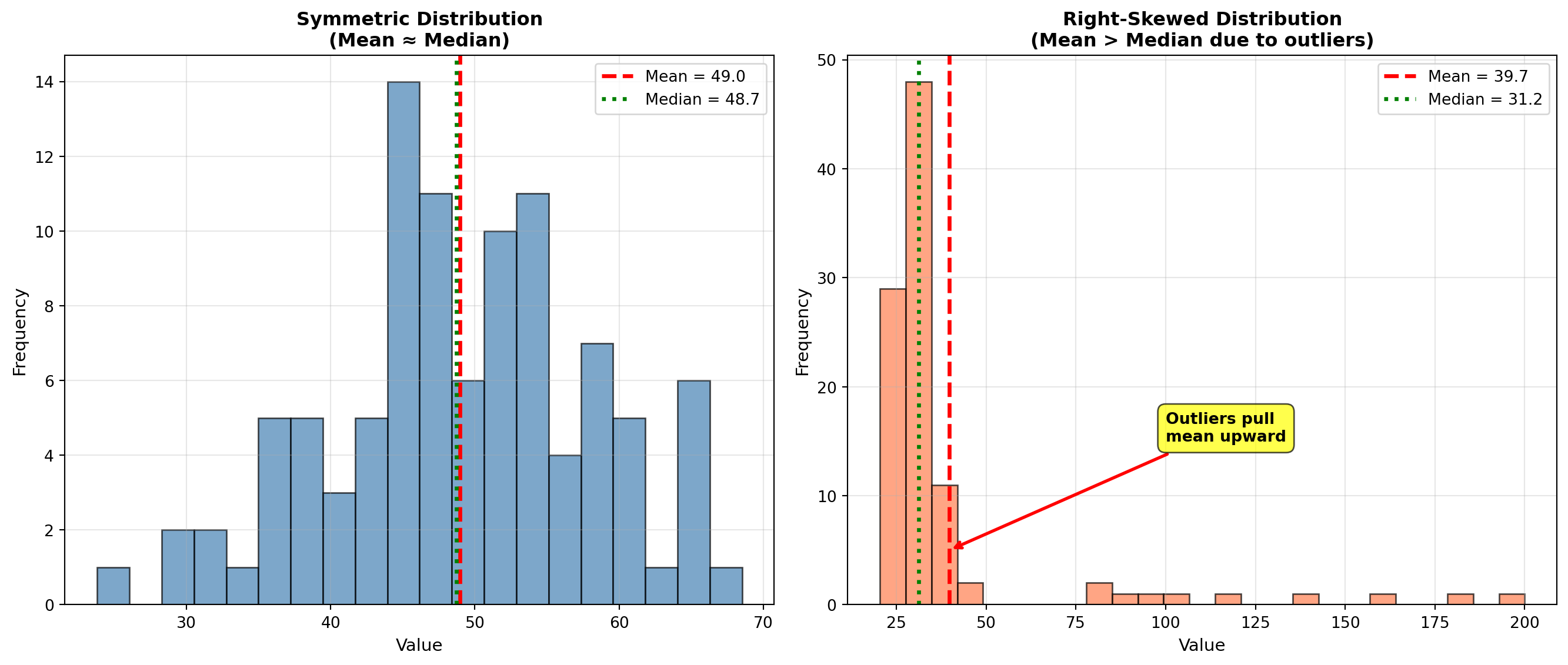 - Right-skewed: Mean > Median (most common for income, prices)