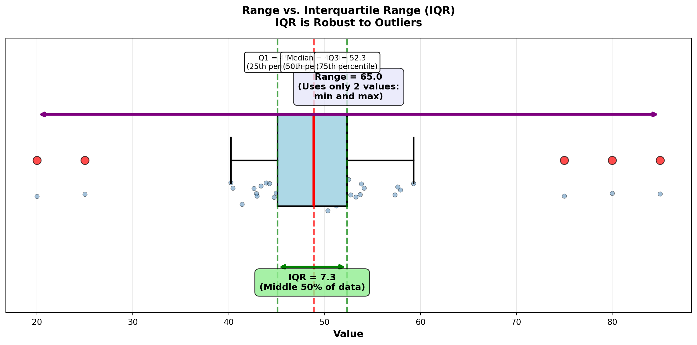 - Interquartile Range (IQR): Q3 - Q1 (middle 50%, robust to outliers)