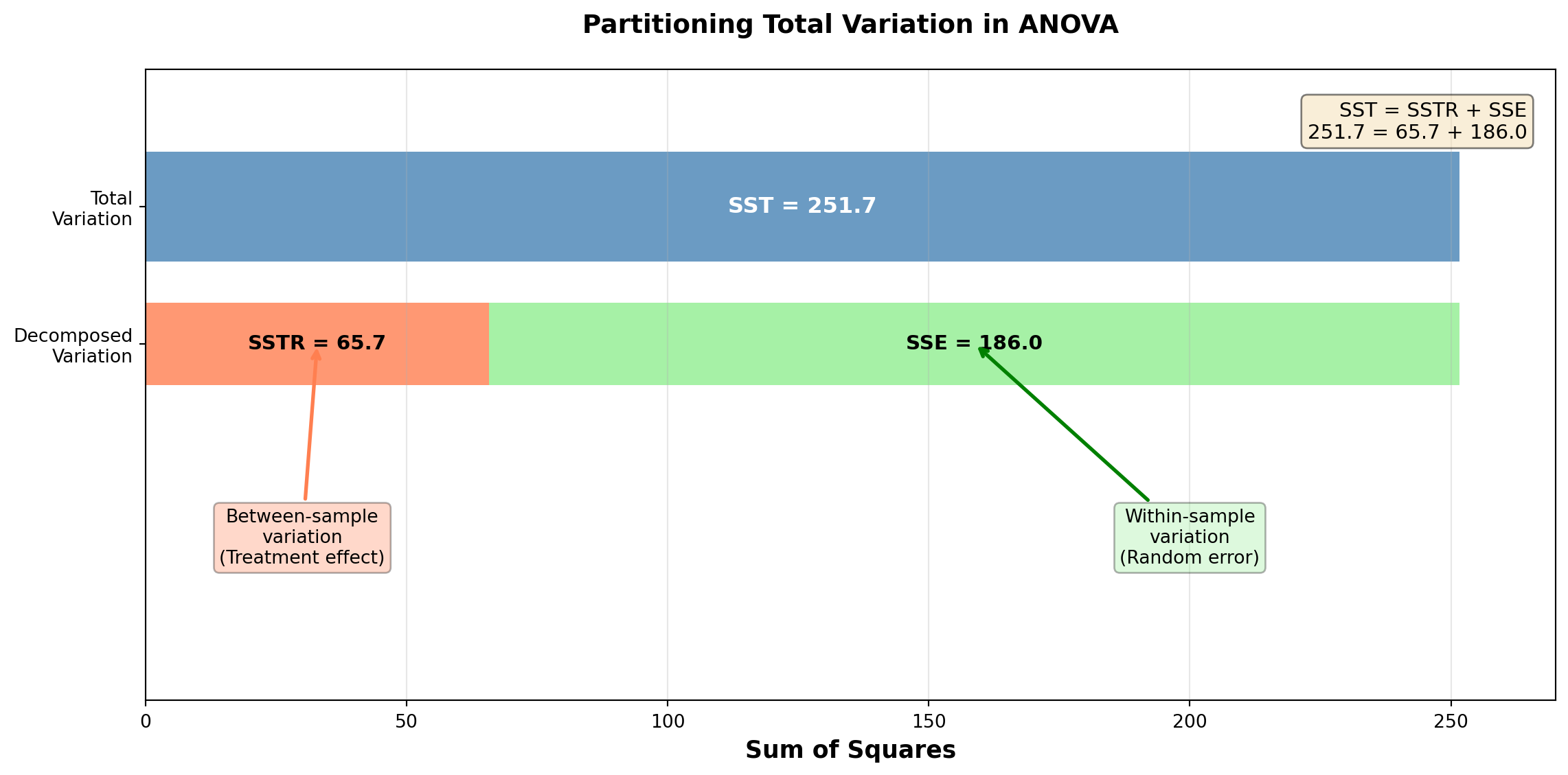 - Calculate sums of squares (total, treatment, and error) for one-way ANOVA