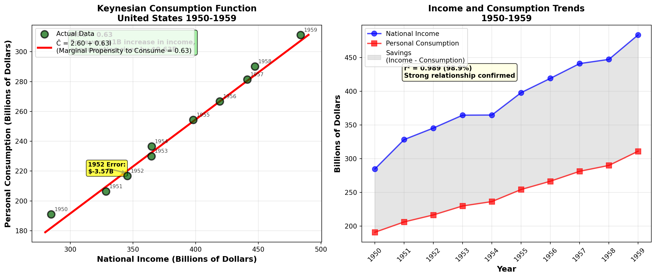 Interpretation: 98.9% of the variation in consumption is explained by changes in income. This extremely high r^2 confirms Keynes’ theory and demonstrates the strong relationship between income and consumption—vital information for policymakers advising Congress and the President on economic policy.