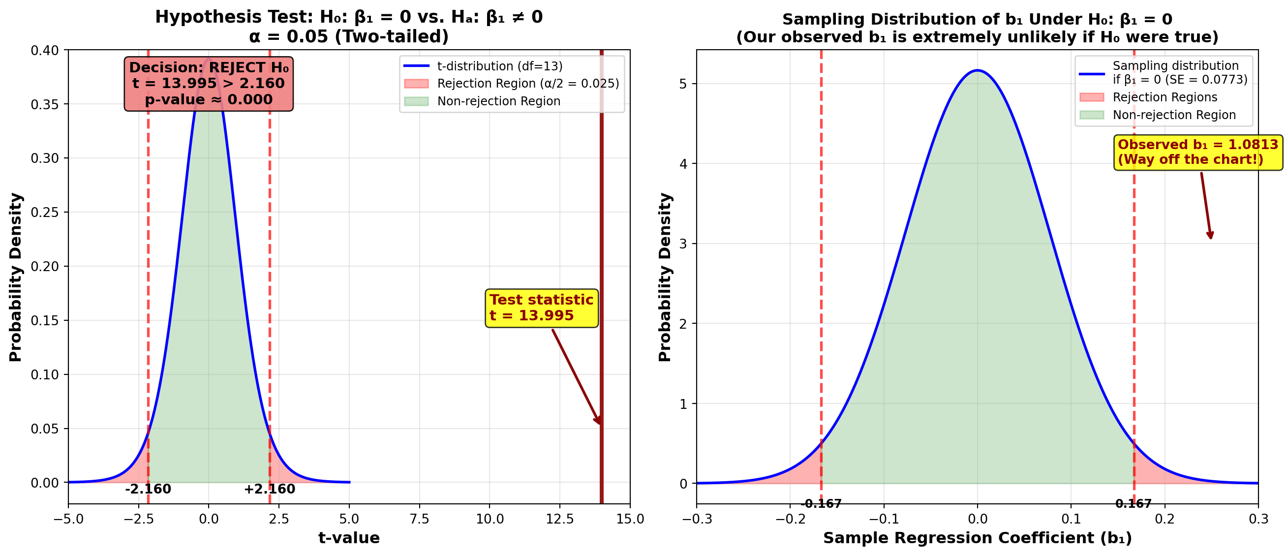Decision: Since t = 2.13 < 2.228, we cannot reject H_0. Despite the sample showing a positive relationship, we cannot reject the hypothesis of zero correlation at the 5% significance level.