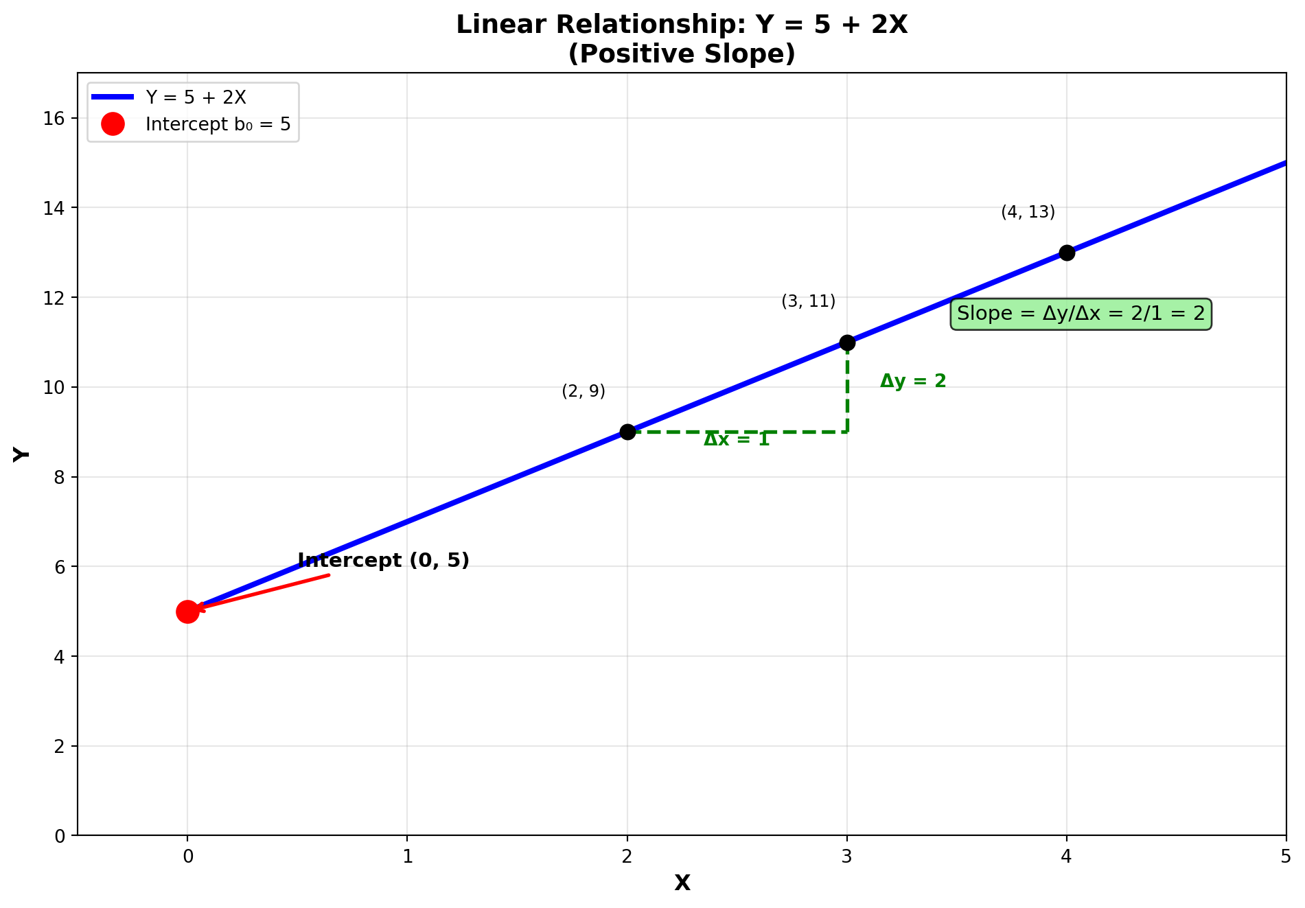 - Intercept (b_0 = 5): The line crosses the Y-axis at 5