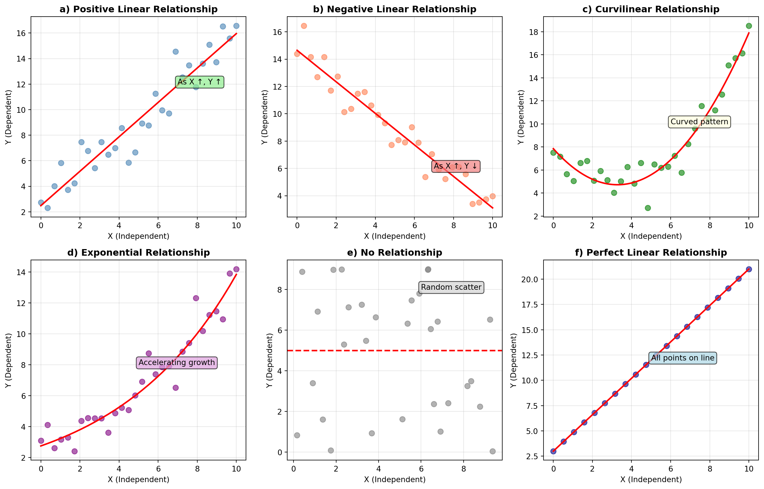 - Figure f): Perfect linear relationship - all points fall exactly on a line (rare in real data)