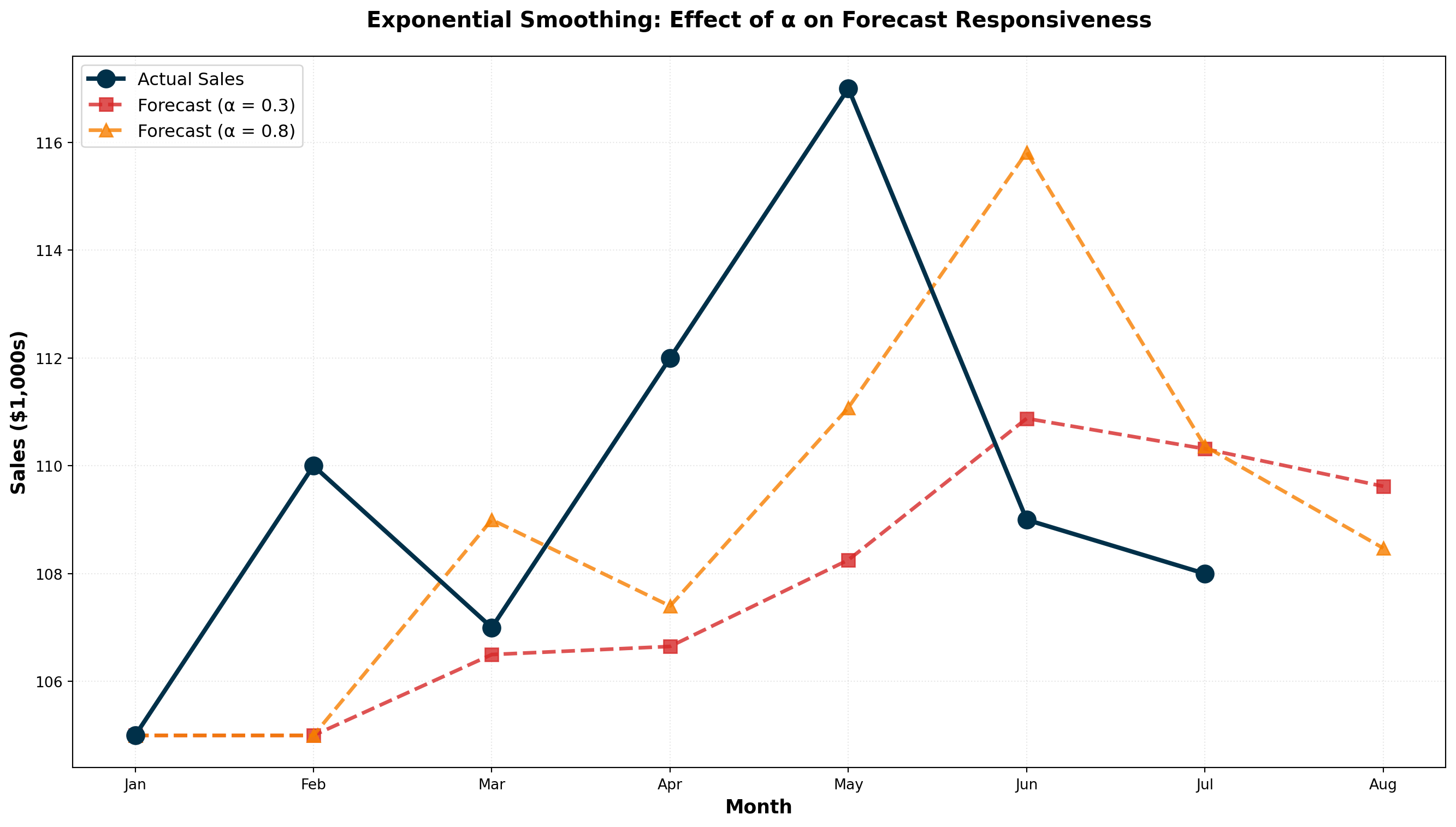 - Exponential Smoothing: Weighted average giving more weight to recent observations, parameter \alpha controls responsiveness