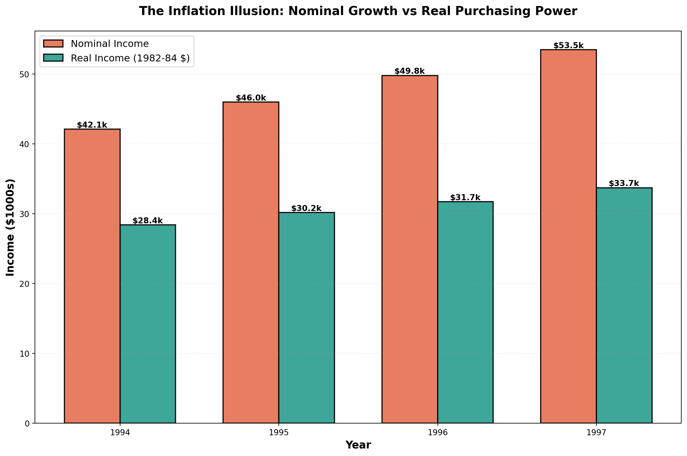 plt.show()The chart dramatically illustrates how inflation erodes purchasing power. While nominal income grew from $42k to $53.5k (27% increase), real purchasing power only grew from $28.4k to $33.7k (19% increase).