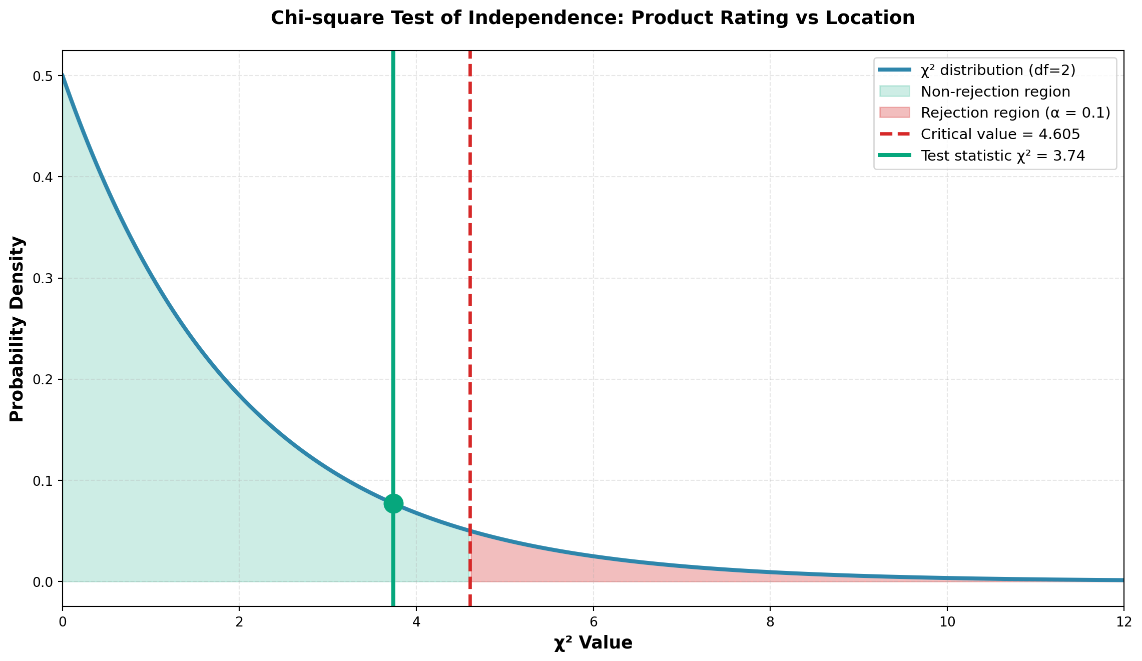 - Expected frequencies: E_{ij} = \frac{(\text{Row Total})(\text{Column Total})}{n}
