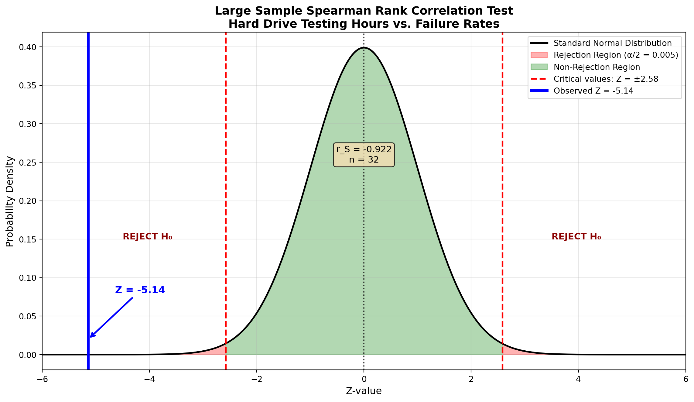 - Large sample (n \geq 30): Z = r_S\sqrt{n-1}