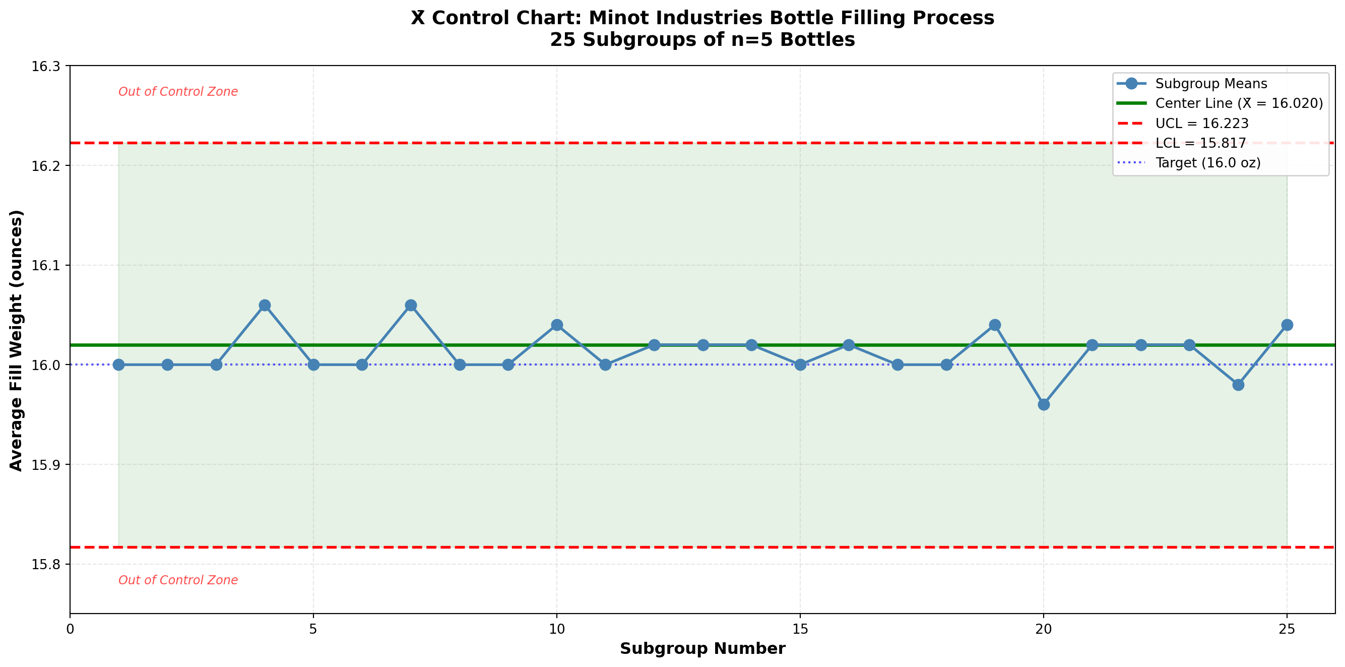 - Installed X̄ and R charts on bottle filling line (Example 15.1-15.2)